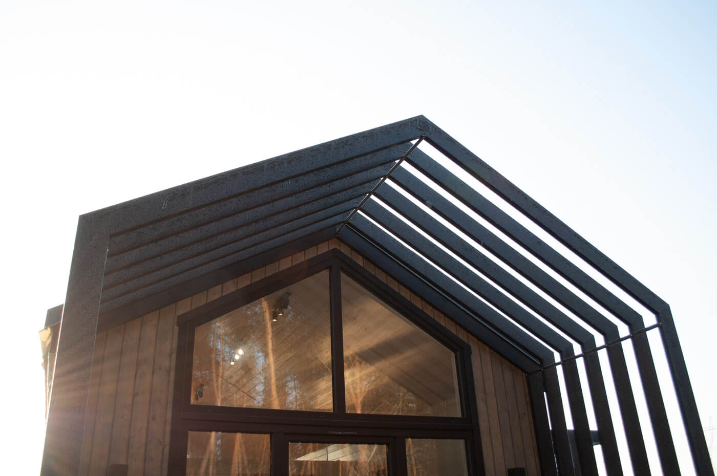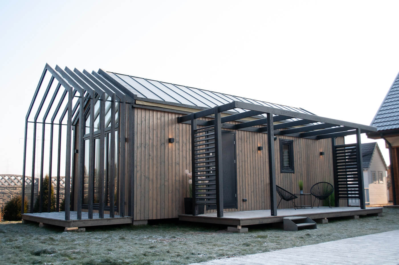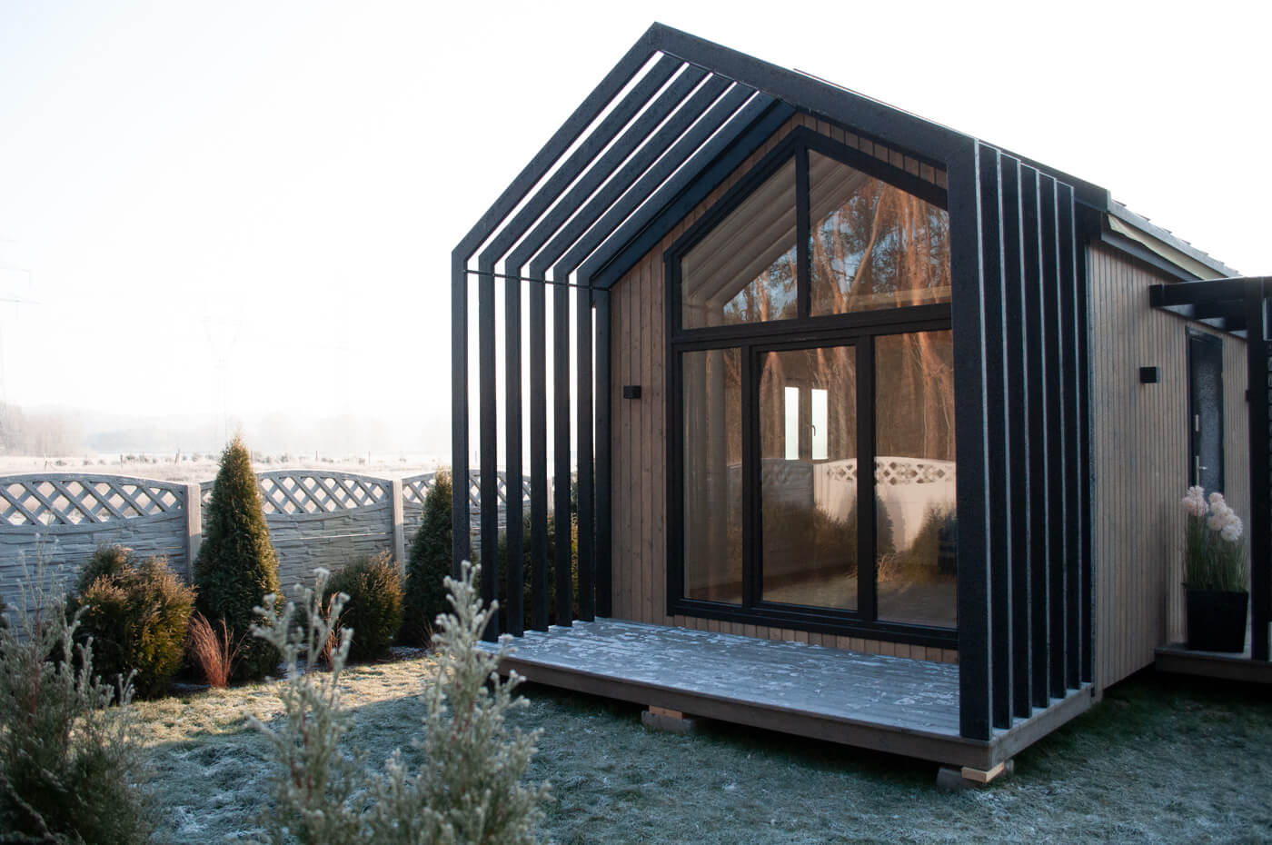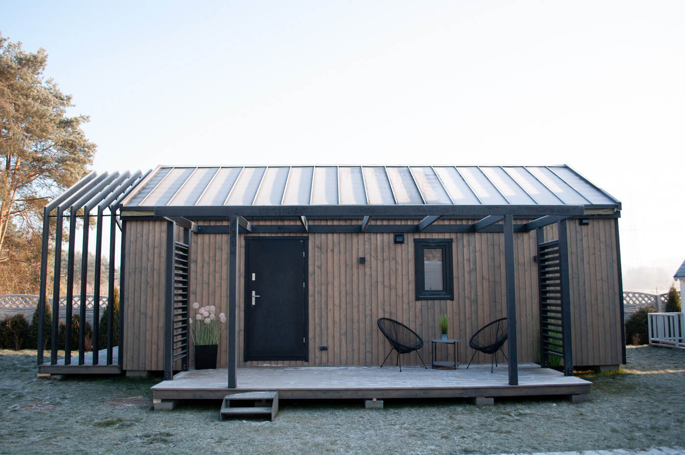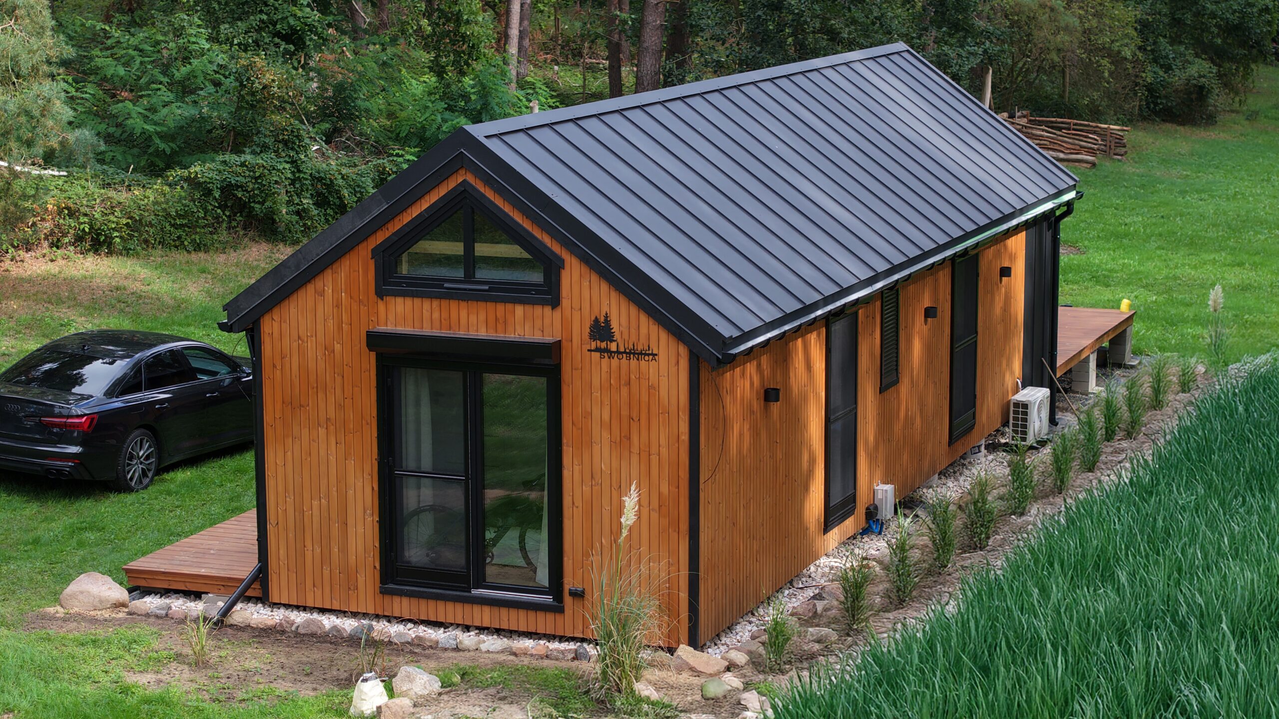 - Integracja z otoczeniem: Dom jednomodułowy w stylu nowoczesnej stodoły harmonijnie łączy się z otoczeniem.